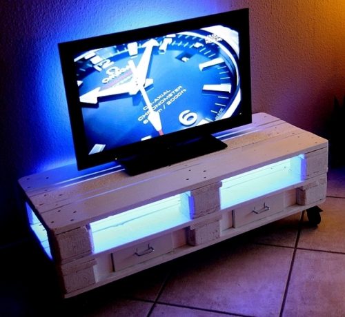 Bei diesem TV-Sideboard im Shabby-Style handelt es sich um ein handgefertigtes Unikat in der Farbe weiß.Verwendet wurden 2 zugeschnittene gebrauchte Euro Paletten. Zur besonderen Ausstattung gehören die 4 Industrierollen, von denen 2 mit Bremsen ausgesta